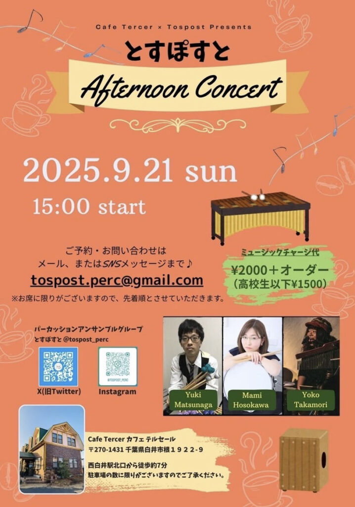 Cafe Tercer(カフェテルセール)様においてアフタヌーンコンサートを行います。ご予約・お問い合わせはお問い合わせよりお願いいたします。